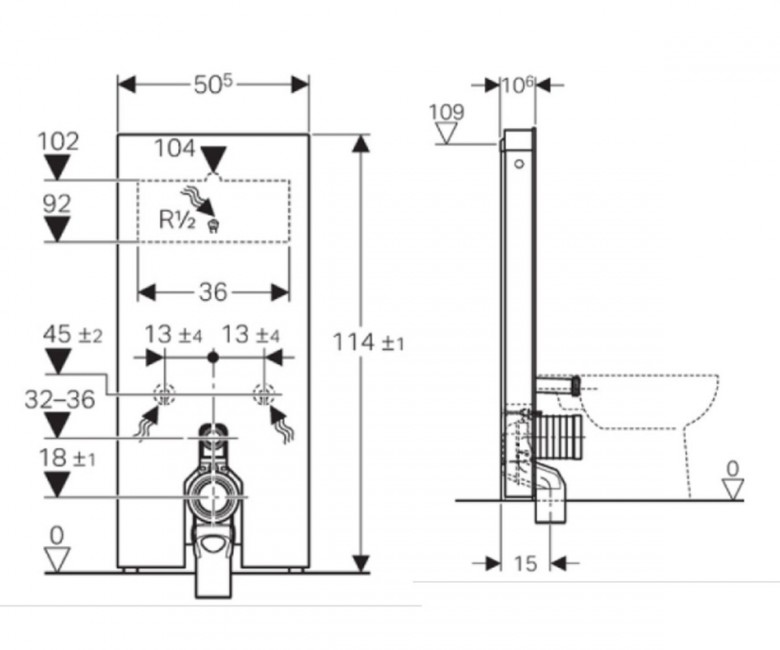 - Для замены напольных унитазов со смывным бачком скрытого монтажа с макс. высотой окна технического обслуживания < 109 см