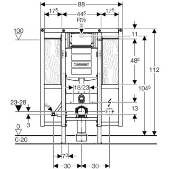 Установка инсталляции Geberit Duofix 111.375.00.5 (из коллекции UP320) производится перед капитальной стеной, пустотелой перегородкой, в гипсокартонной перегородке или же на капитальной стене с облицовкой панелями. Подвод воды может осуществляться как сзади, так и сверху бачка. Конструкция имеет размеры 880х1120 мм и глубину 170 мм. Из особенностей стоит выделить возможность немедленного смыва сразу после установки (позволяет проверить работоспособность установки), монтаж скрытого бачка осуществляется без применения инструментов, наличие звукопоглощающих приводных шлангов. На товар распространяется гарантия сроком на 10 лет.