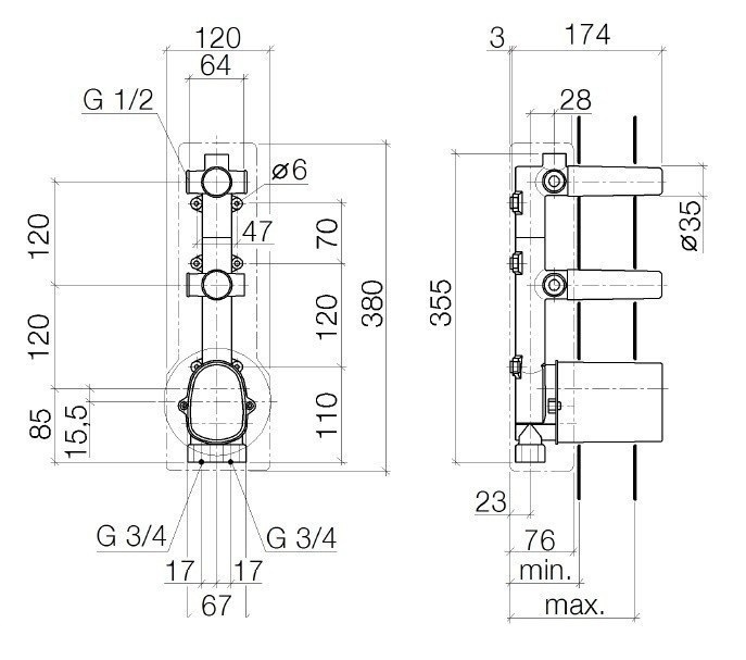- 2 присоединения – внутренняя резьба 3/4 (холодное/горячее)