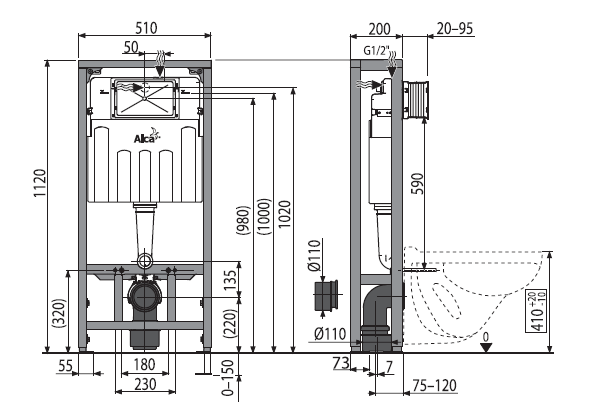 Скрытая система инсталляции AlcaPlast Solomodul для сухой установки (в пространство) AM116/1120