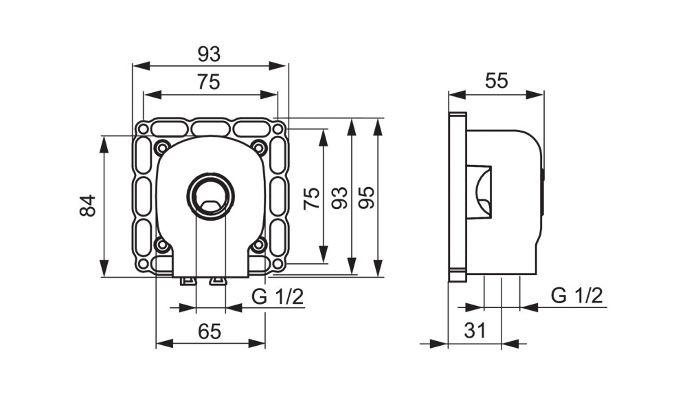 Скрытый встраиваемый корпус Hansa Matrix соединительный уголок. Система крепления Multifix, внутренняя резьба, G ½, материал корпуса - неоцинкованная латунь, изоляционный пакет.