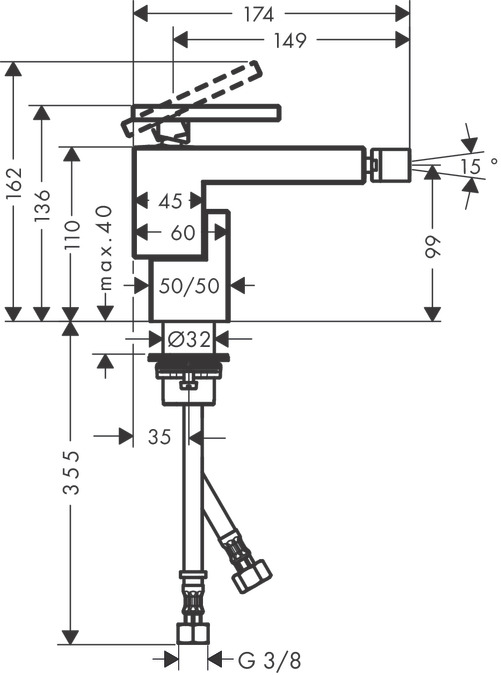 - состоит из: однорычажного смесителя для биде, слив/перелив