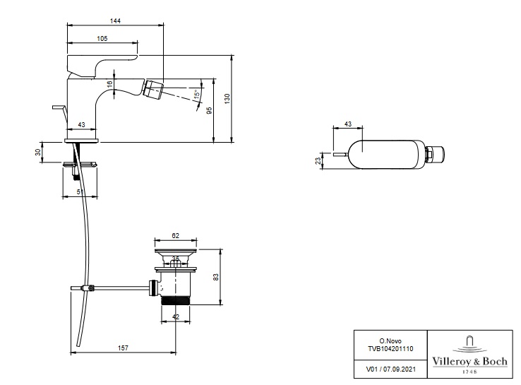 Смеситель для биде Villeroy & Boch O.novo с донным клапаном хром TVB10420111061