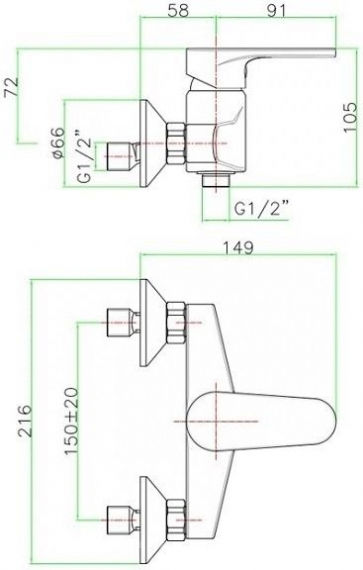 - Подключение душа: G ½