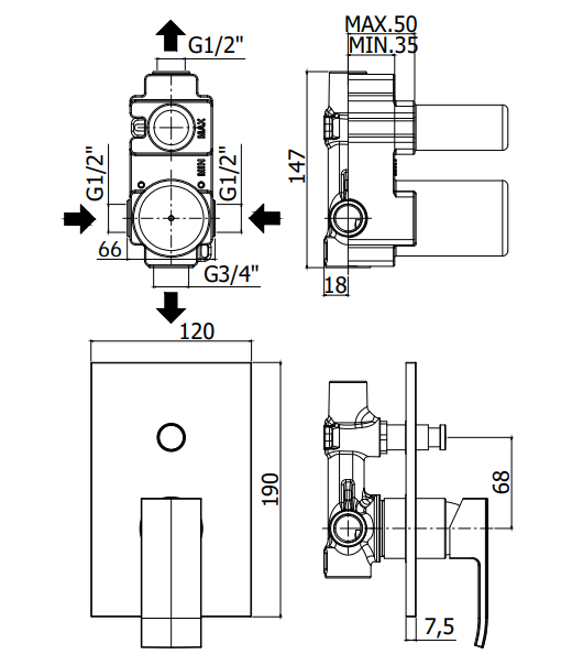 - Комплектация: настенная тарелка 120x190 мм, 1/2 ”G горячее/холодное верхнее соединение, 3/4” G нижнее соединение