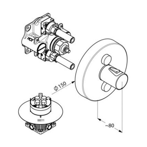 Данная модель имеет 2 кнопки вкл/выкл (для лейки и для верхнего душа), отвечающие за подачу единого нерегулируемого потока воды, а также рукоять для регулировки температуры воды. Термостатический элемент имеет ограничитель горячей воды при 38°C. В комплекте идет: термостатический элемент, внешняя монтажная часть, крепление.