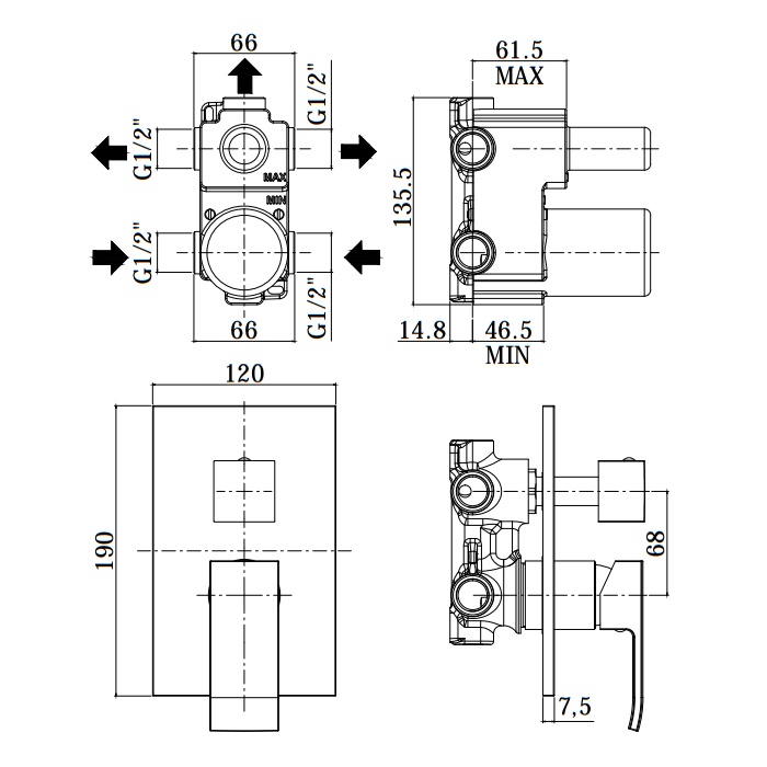 - Скрытый монтаж: комплект внешняя и внутренняя части смесителя