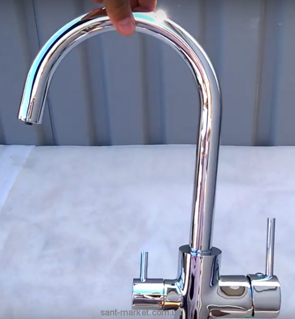 - Кран изготовлен таким образом, что бы техническая и фильтрованная вода не смешивались друг с другом. Для данной цели используются два независимых канала подачи проточной и питьевой воды, которые сосредоточены внутри трубкообразного излива.