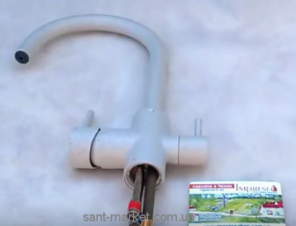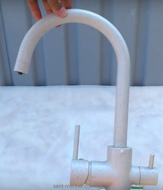 - Кран изготовлен таким образом, что бы техническая и фильтрованная вода не смешивались друг с другом. Для данной цели используются два независимых канала подачи проточной и питьевой воды, которые сосредоточены внутри трубкообразного излива.