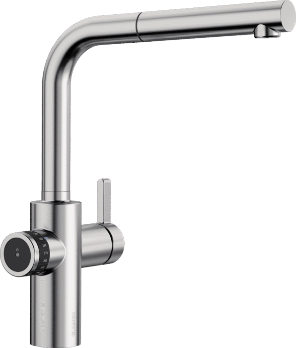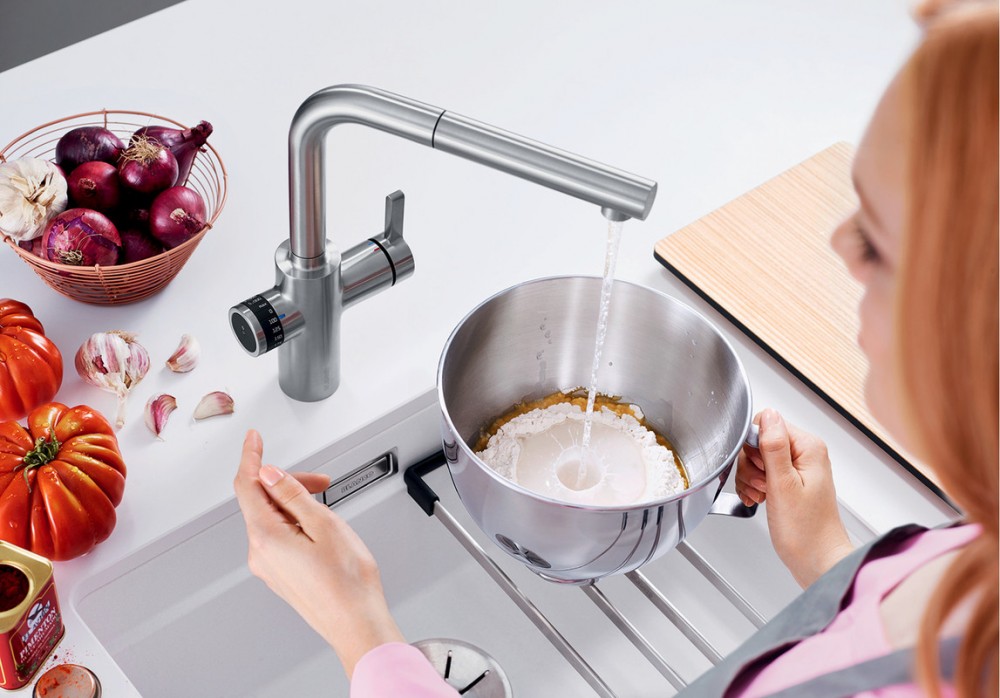 Смеситель для кухни Blanco Evol-S с функцией мерного стакана подойдет тем, кто любит удобство и точность во всем! С помощью поворотной шкалы вы можете задать необходимый вам объем воды, после чего нажать сенсорную кнопку сбоку, и смеситель подаст вам нужное количество воды, регулируя при этом мощность напора в зависимости от выбранного объема: чем больше желаемое количество воды, тем сильнее струя и быстрее поток воды. В результате вы не тратите лишнее время на ожидание. Еще один плюс кухонного смесителя Blanco Evol-S - экономия расходов и сбережение природных ресурсов. Ведь точное потребление воды означает прекращение ненужного расхода самого важного ресурса на земле. Для еще большего удобства в наполнении больших ёмкостей смеситель Evol-S оснащен выдвижной лейкой с нейлоновой оплеткой шланга.