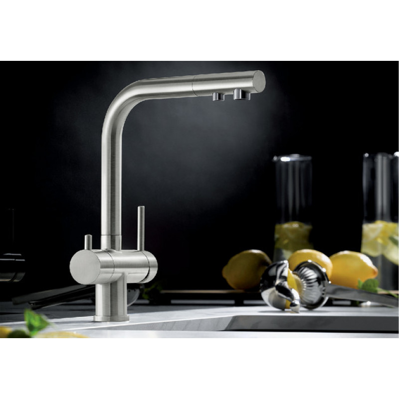 Удобный 2-в-1-смеситель с рычагом холодной и горячей воды справа, и рычагом для фильтрованной воды слева