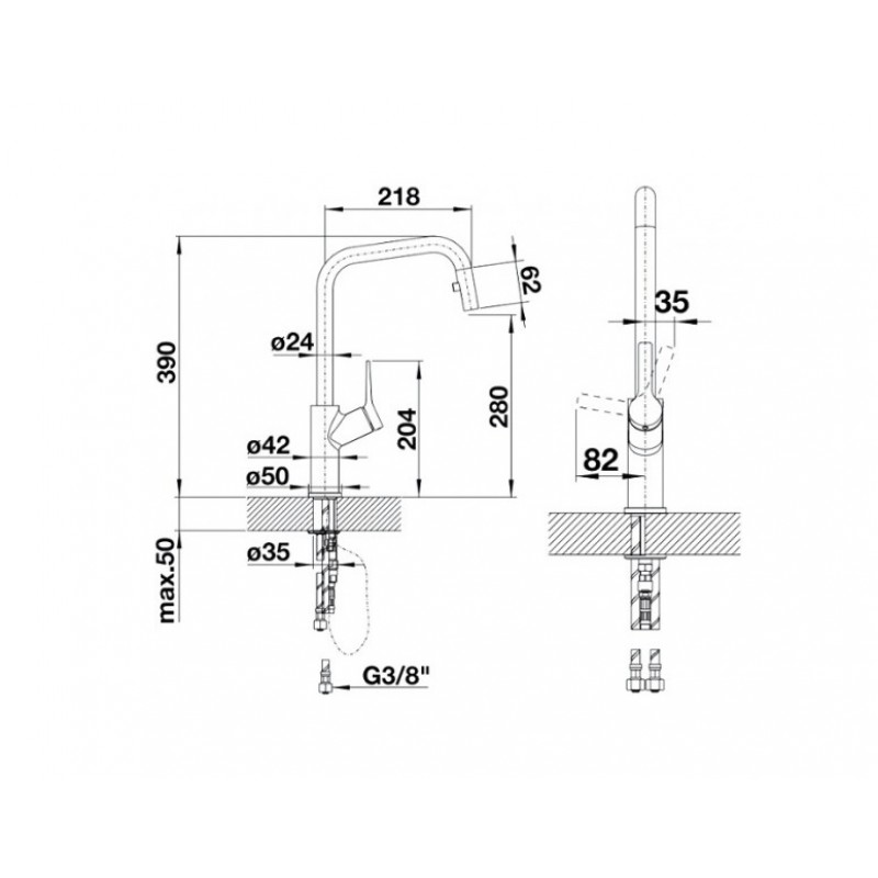 - Легкое подключение гибкими шлангами длиной 450 мм с гайкой ⅜“