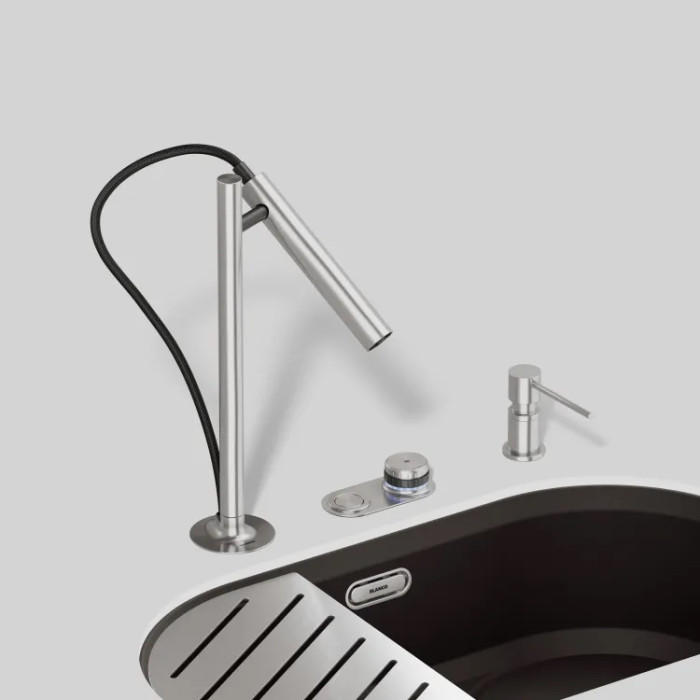 Каждый LUNEOO комплектуется двумя разными базовыми панелями для дистанционного управления: одна – с дополнительным отверстием для дистанционного управления сливом BLANCO, другая – без отверстия.