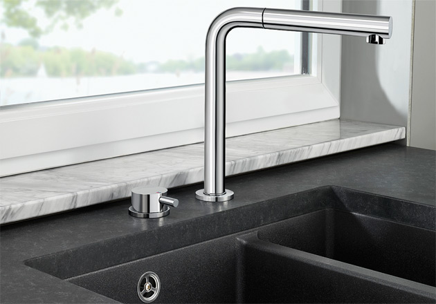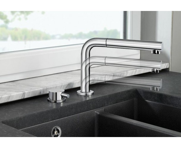 Выдвижной смеситель Blanco Periscope-S-F II для установки возле окна. Актуальный современный дизайн. Высокий выдвижной излив. Уникально: остается работоспособным в любом положении. Шланг выдвижного излива в металлической оплетке. Стандартные отверстия (2x35мм) для установки смесителя и рычага управления (независимо от расположения). Прекрасно подходит для комбинирования с чашами для монтажа под столешницу.