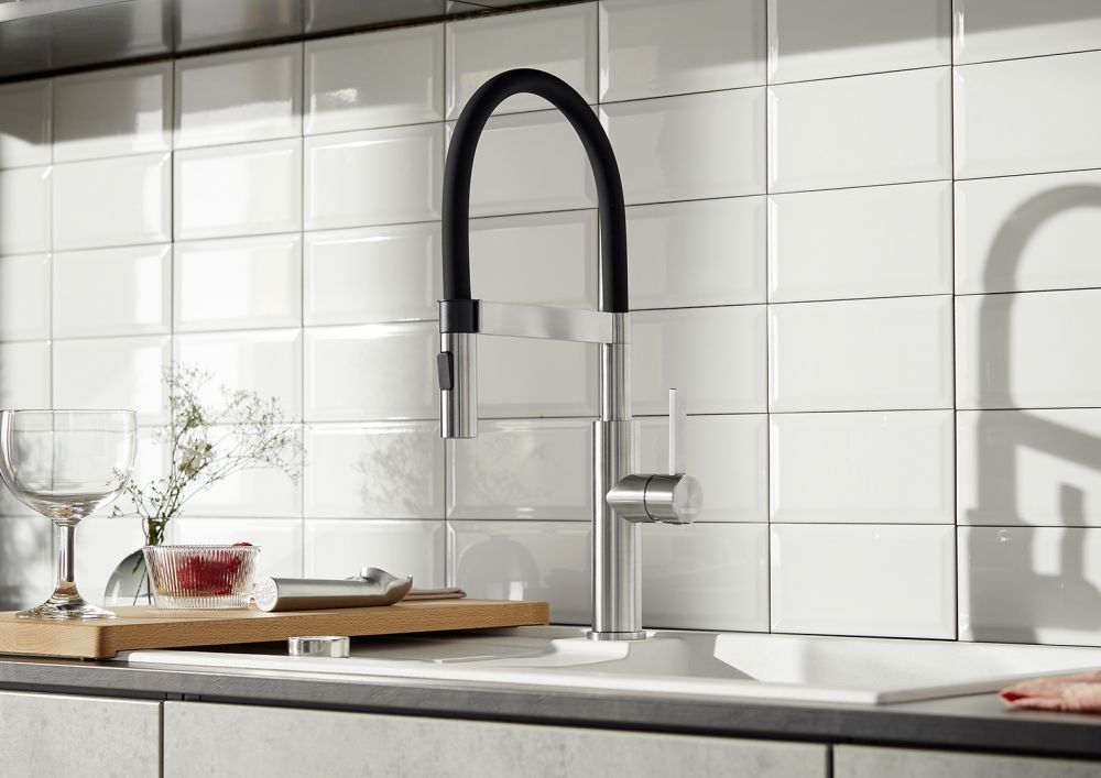- Смеситель классического дизайна с черными акцентами, идеально подходящий для современной кухни