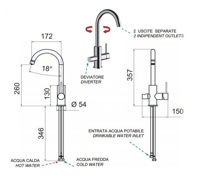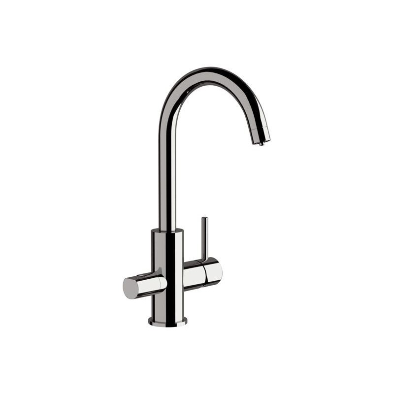 - Кухонный однорычажный смеситель трехходовой с поворотным изливом и двумя полностью независимыми выходами, с возможностью отбора питьевой воды через рычаг