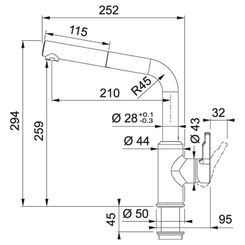Врезной однорычажный кухонный смеситель Franke Urban с выдвижным шлангом (160 см), рычагом сбоку и многоуровневым аэратором.