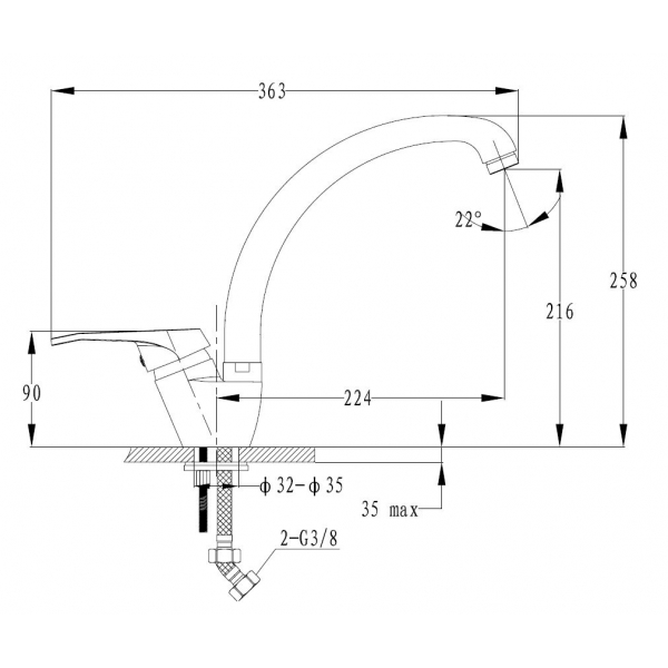 Длина излива 224 мм