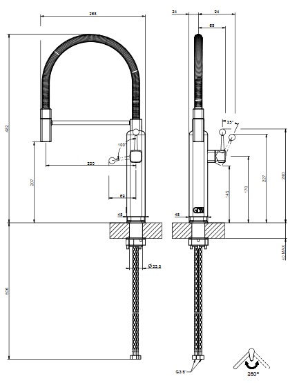 - Область поворота излива: 360°