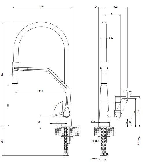 - Выдвижная лейка (излив/душ): есть