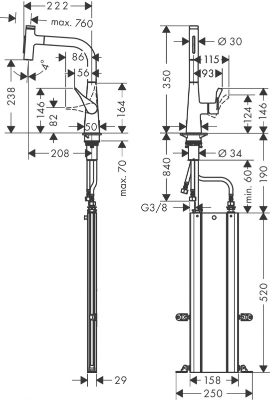 - угол поворота излива: регулировка на 2 уровня, на 110° или 150°