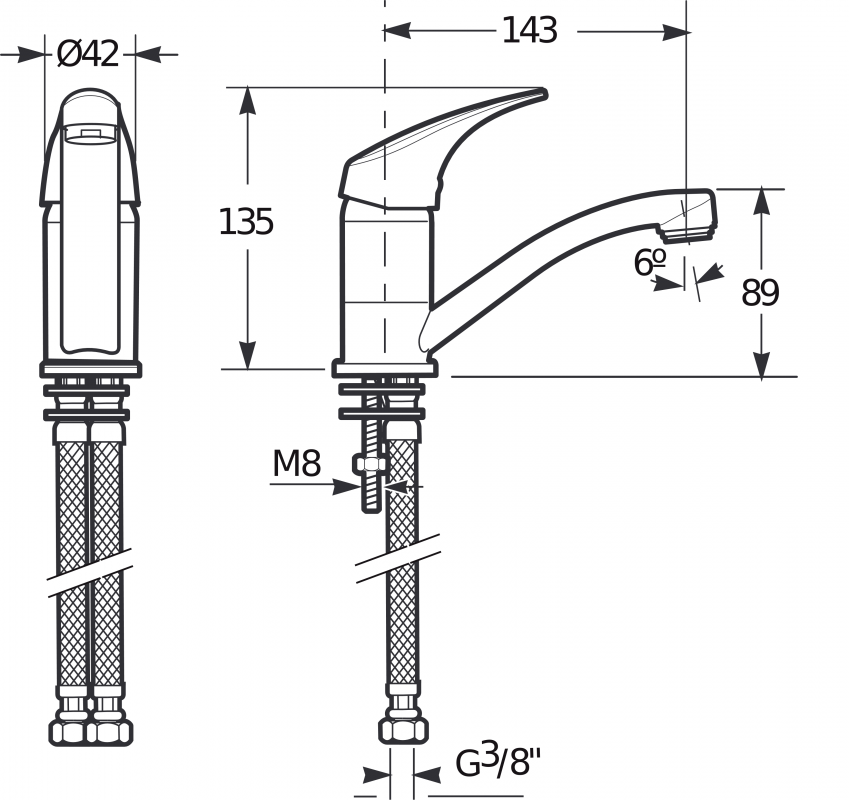 - Длина излива: 143 мм