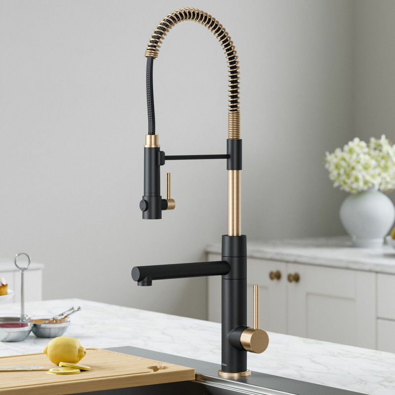 1) Смеситель для кухни Kraus Artec Pro с выдвижной лейкой бронза шампань/черный