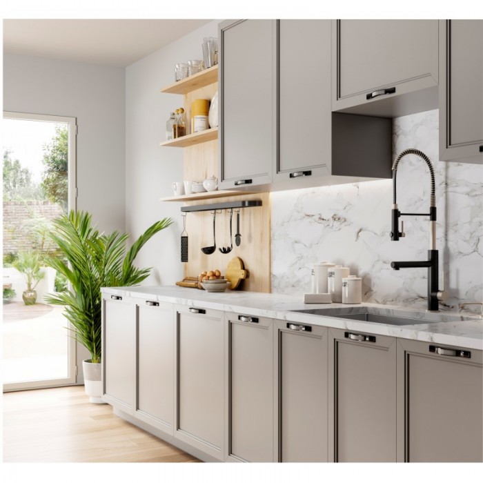 Элегантный смеситель для кухни Kraus Artec Pro отличается промышленной эстетикой и высокими техническими возможностями. Универсальная металлическая конструкция с гибким шлангом внутри пружины промышленного класса имеет два отдельных крана: лейка-спрей с эргономичным держателем предназначена для предварительного ополаскивания и удаления твердых остатков пищи, а поворотный кран служит для наполнения посуды водой аэрированных потоком. Магнитный держатель надежно фиксирует распылитель на месте, предлагая максимальную эффективность для повседневных задач.