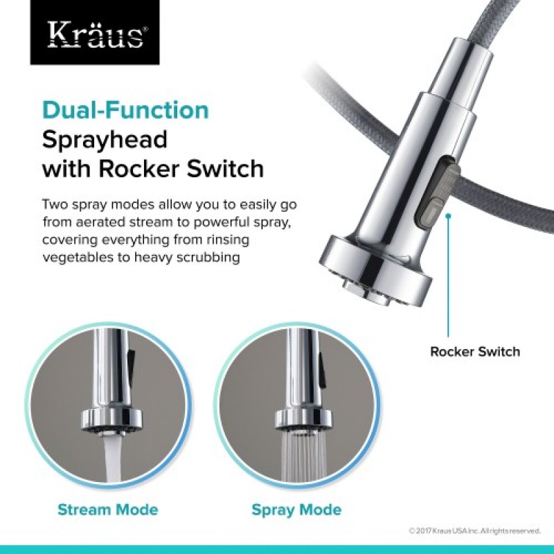 - Двухфункциональный распылитель с переключателем Rocker обеспечивает попеременное переключение режима подачи воды и легкий переход от аэрированного потока к мощному спрею. Позволяет выполнять любые функции - от ополаскивания до интенсивной чистки.