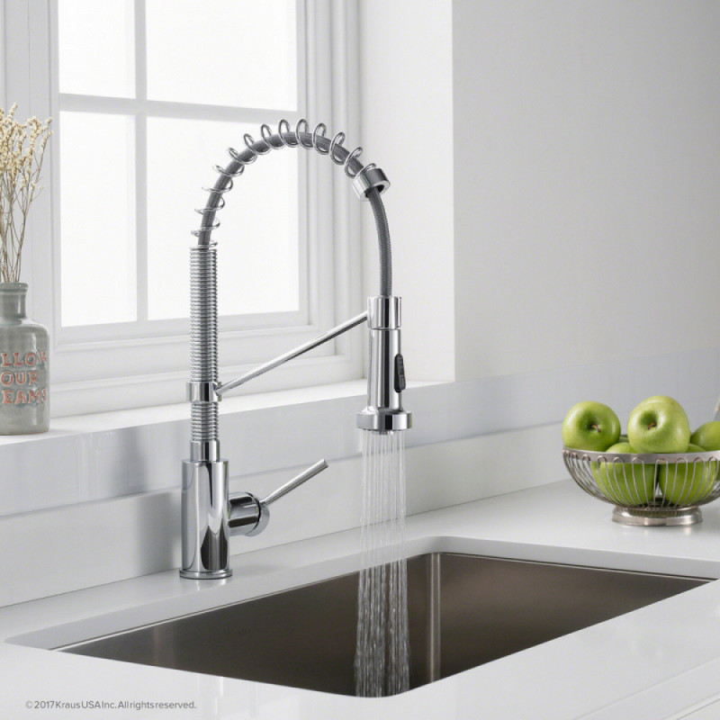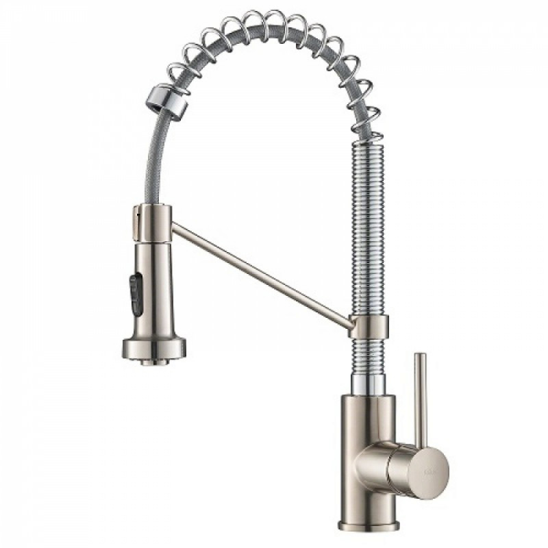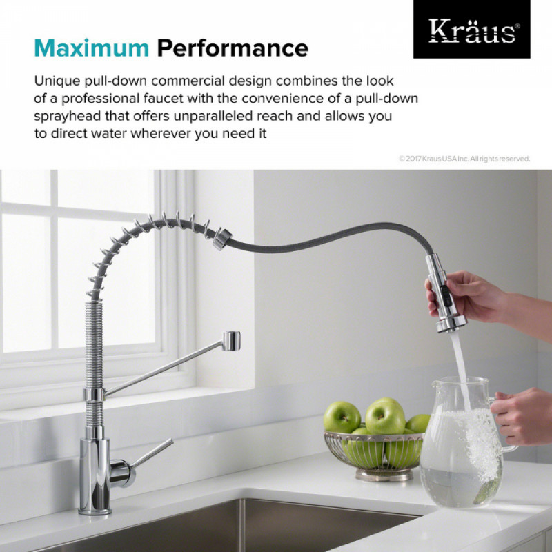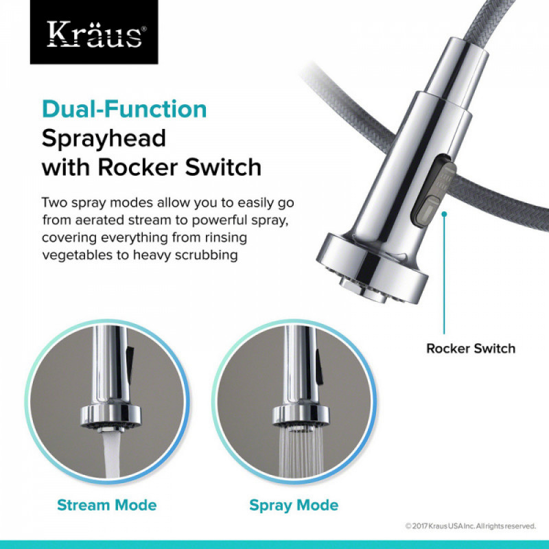 Пружинный смеситель с выдвижной лейкой Bolden KPF-1610 от Kraus подходит для большинства кухонь, имея высоту 456 мм. Преимуществом этой модели является также выдвижная лейка на гибком шланге длиной 406 мм, что обеспечивает превосходную маневренность. 2-функциональная эргономичная лейка с переключателем дает пользователям возможность мгновенно переключаться из режима аэрированного потока в режим мощного душа.