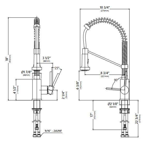 Пружинный излив и открытый носик промышленного типа, а также прочный держатель для лейки придают домашней кухне профессиональный вид и стиль.