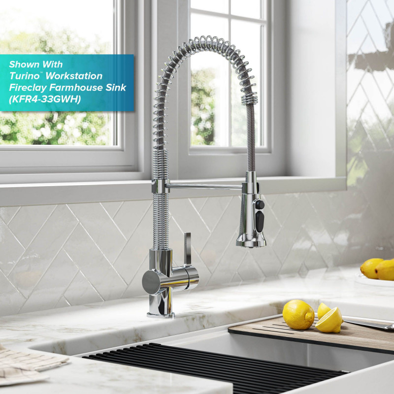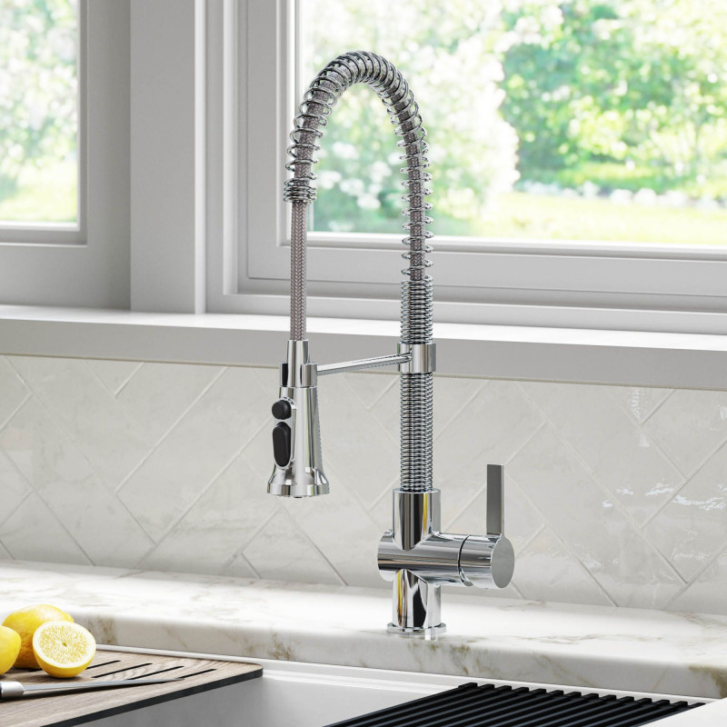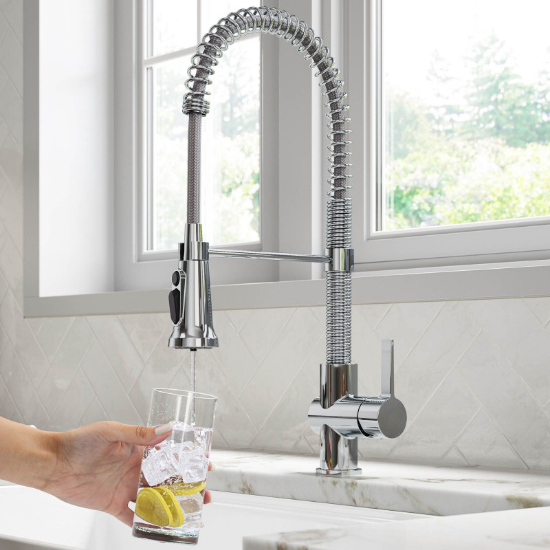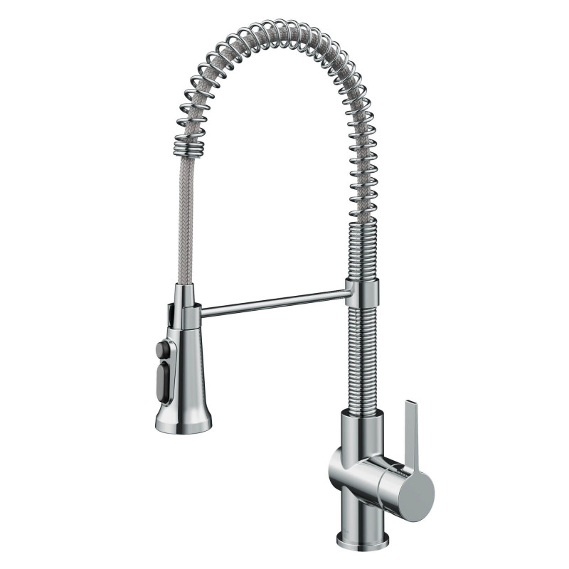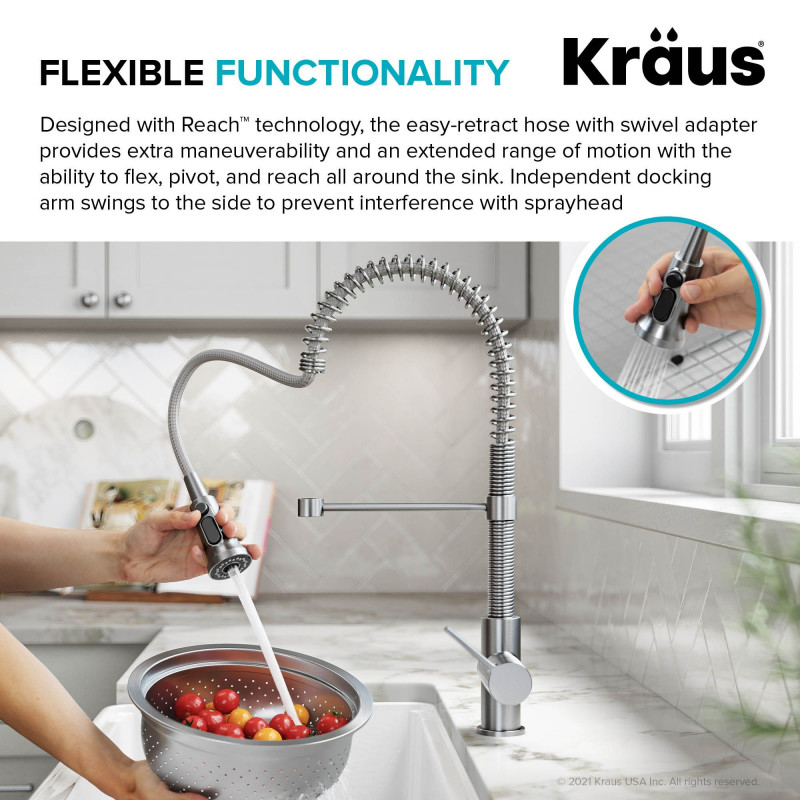 КОММЕРЧЕСКИЙ ДИЗАЙН С ВЫКЛЮЧАТЕЛЬНЫМ ДАВЛЕНИЕМ создает профессиональный вид с промышленным изливом с открытой спиралью и предлагает удобство вытягивающейся головки с расширенным диапазоном движения