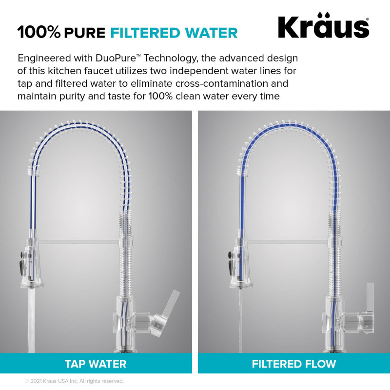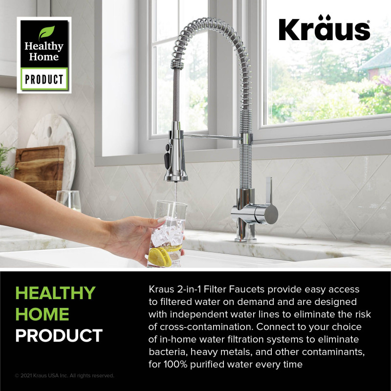 СОВМЕСТИМОСТЬ С: 2-ступенчатая система фильтрации воды под раковиной Kraus® Purita™ с угольным блоком (FS-1000) улучшает качество воды, удаляя загрязнения размером до 0,5 микрон, чтобы вы могли наслаждаться безопасной, чистой, великолепной на вкус водой по требованию (продается отдельно).