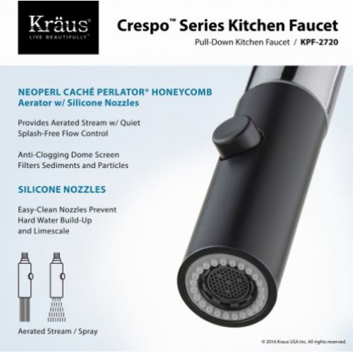 CRESPO KPF-2720 - кухонный смеситель с одним рычагом для управления напором и температурой воды. Подача воды осуществляется в двух режимах: прямая струя и распыление. Мягкие резиновые насадки в распылительной головки предотвращают тяжелую воду и известковый нарост, что делает обслуживание легким. Уникальный дизайн и сочетание нержавеющей стали и матового «черного оникса в отделке дает прекрасную возможность для сочетания его с мойками из нержавеющей стали.