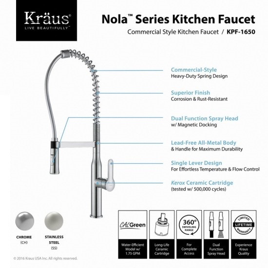 NOLA KPF-1650CH - кухонный смеситель с одним рычагом для управления напором и температурой воды. Подача воды осуществляется в двух режимах: прямая струя и распыление. Мягкие резиновые насадки в распылительной головки предотвращают тяжелую воду и известковый нарост, что делает обслуживание легким. Уникальный дизайн из нержавеющей стали дает прекрасную возможность для сочетания его как с гранитными мойками, так и с мойками из нержавеющей стали.