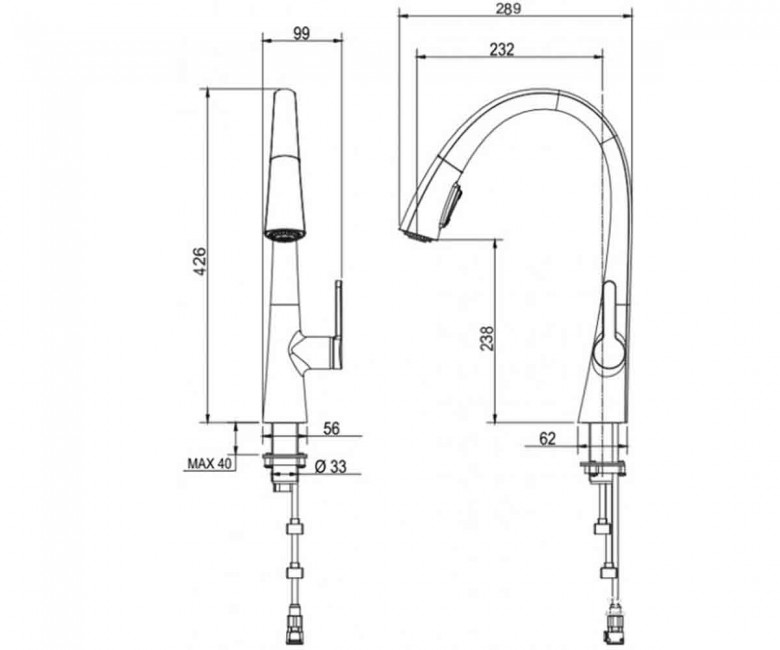 - Выдвижная головка обеспечивает два режима подачи воды : аэрированный поток или спрей.