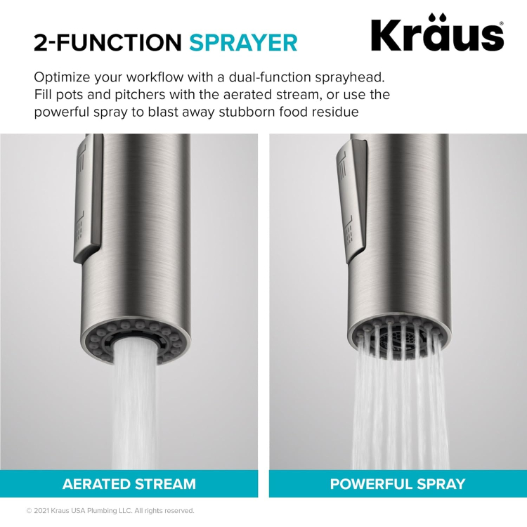 - Двухфункциональная распылительная лейка: Выбирайте между аэрированной струей и мощным распылением, чтобы справиться со всеми задачами – от ополаскивания до чистки.