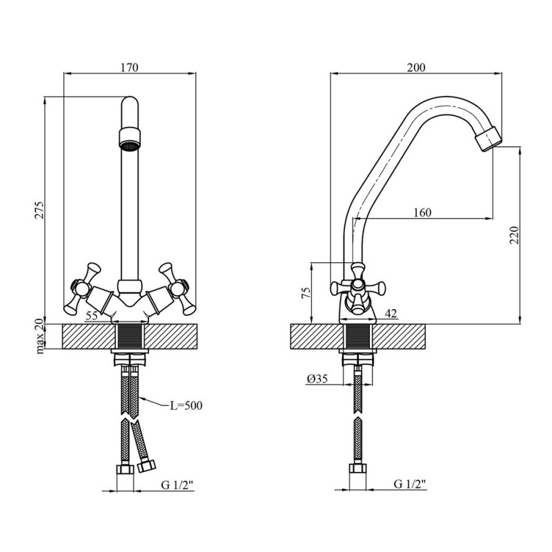 Смеситель для кухни Kroner KRM Rhein-C030 двухвентильный хром