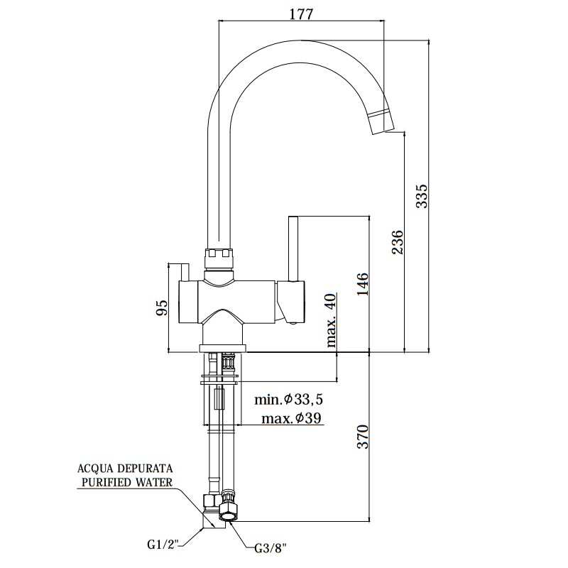 - Размер врезного отверстия: min. Ø 33.5 мм, max. Ø 39 мм