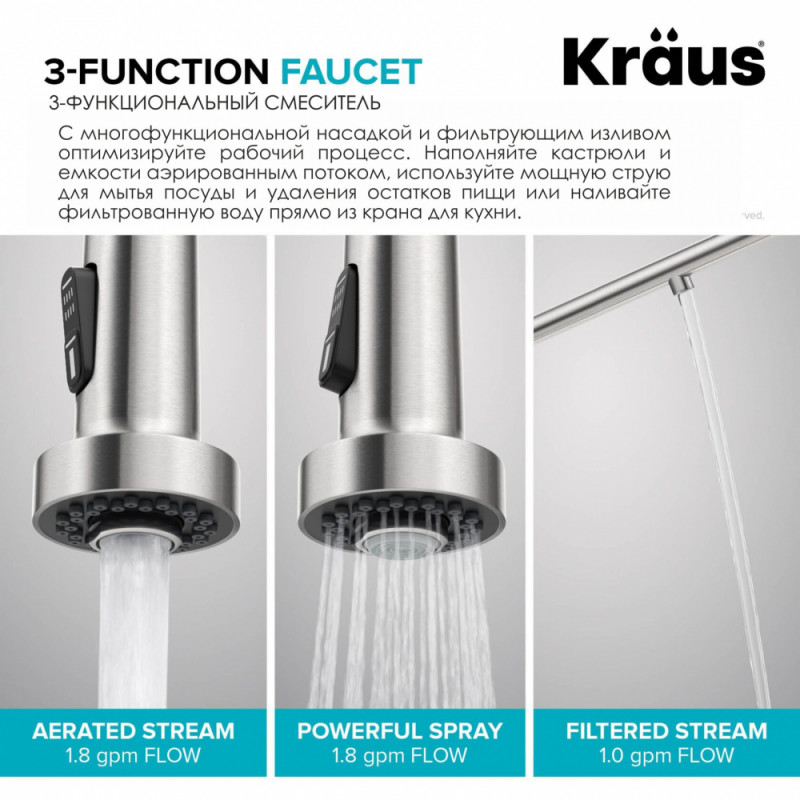 Смеситель для кухни с подключением к фильтру Kraus Bolden с выдвижной лейкой латунь хром
