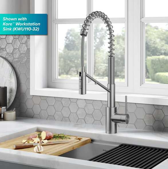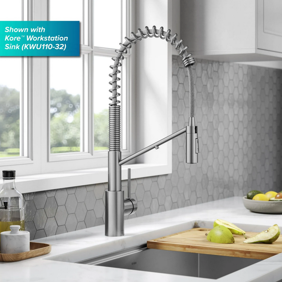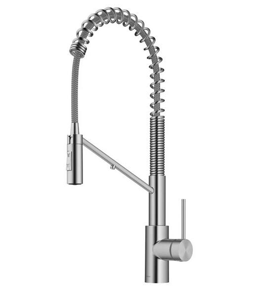 КОММЕРЧЕСКАЯ КОНСТРУКЦИЯ С ВЫТЯЖНЫМ ИЗЛИВОМ создает профессиональный вид благодаря гладкому изливу с открытой спиралью и предлагает удобство выдвижной распылительной головки с расширенным диапазоном движения.