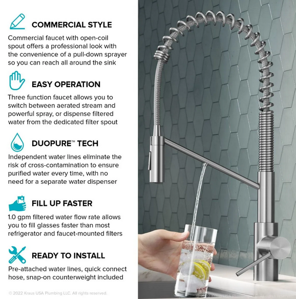 СМЕСИТЕЛЬ под ФИЛЬТР 2-В-1: Кухонный смеситель со встроенным краном с фильтром для воды обеспечивает легкий доступ к фильтрованной воде для питья, приготовления пищи или наполнения бутылок с водой и лотков для льда. Устраняет необходимость в отдельном кране-диспенсере для питьевой воды.