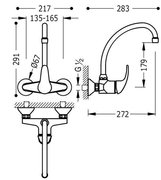 1) Смеситель для кухни Tres Monotres 2000 однорычажный настенный хром