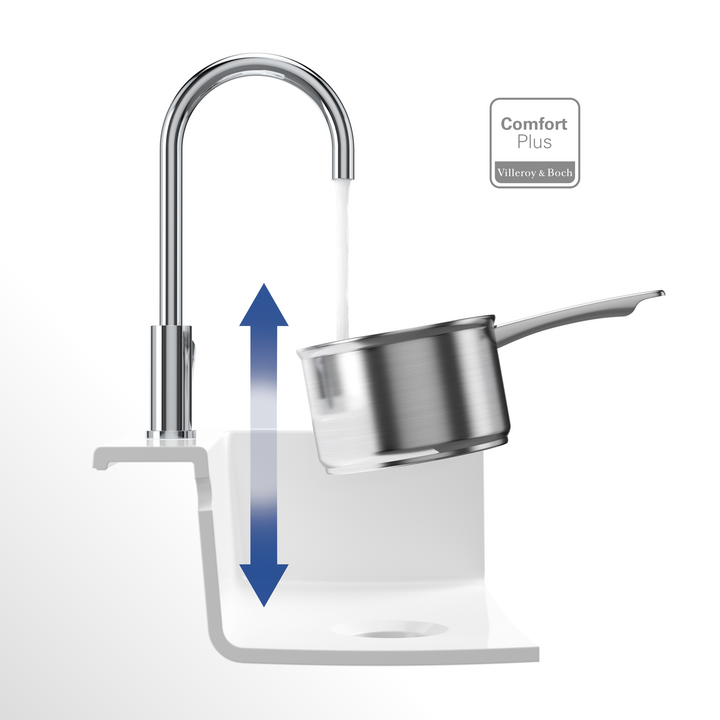 Смесители ComfortPlus имеют удобную высоту и дают свободу перемещения. Это отличное решение для легкой очистки противней и заполнения больших емкостей для оптимального удобства использования в зоне мойки.