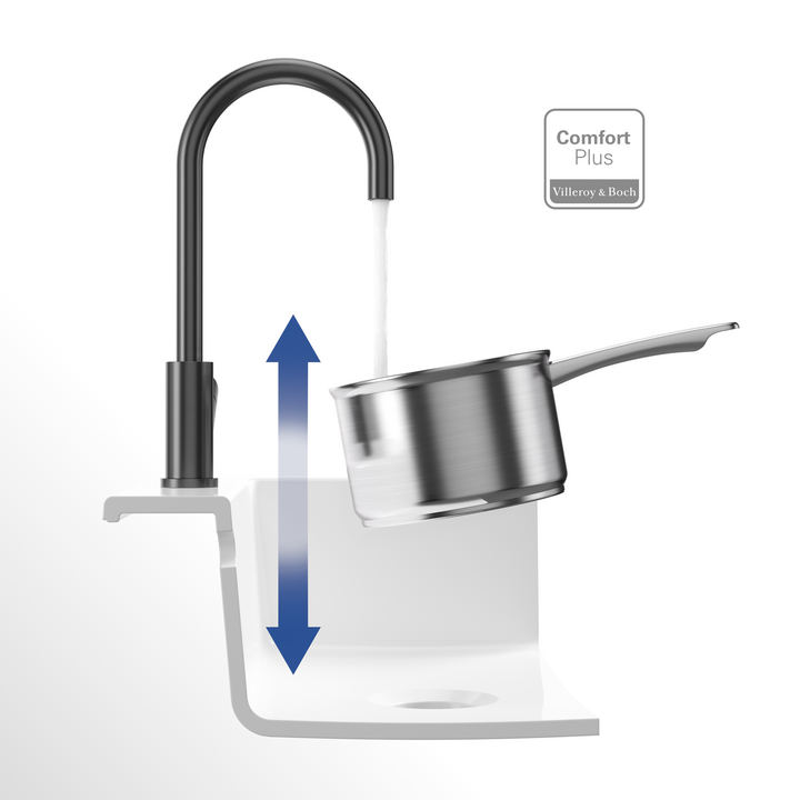 Смесители ComfortPlus имеют удобную высоту и дают свободу перемещения. Это отличное решение для легкой очистки противней и заполнения больших емкостей для оптимального удобства использования в зоне мойки.