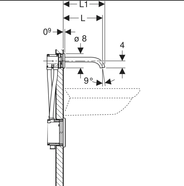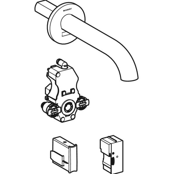 - Для монтажа в монтажные элементы Geberit для умывальника, электронный встраиваемый в стену смеситель с функциональным блоком скрытого монтажа