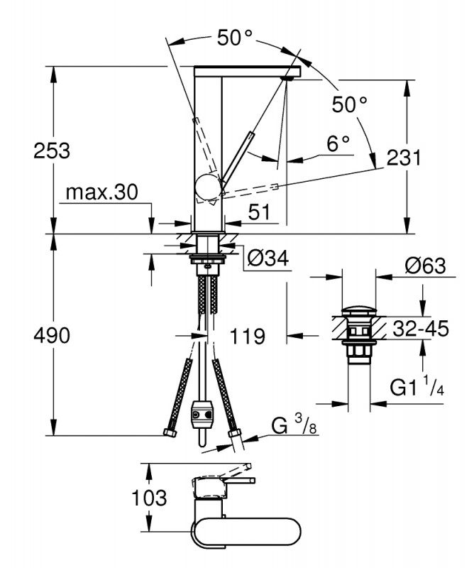 Смеситель для раковины Grohe Plus с донным клапаном выдвижной излив латунь хром 23844003