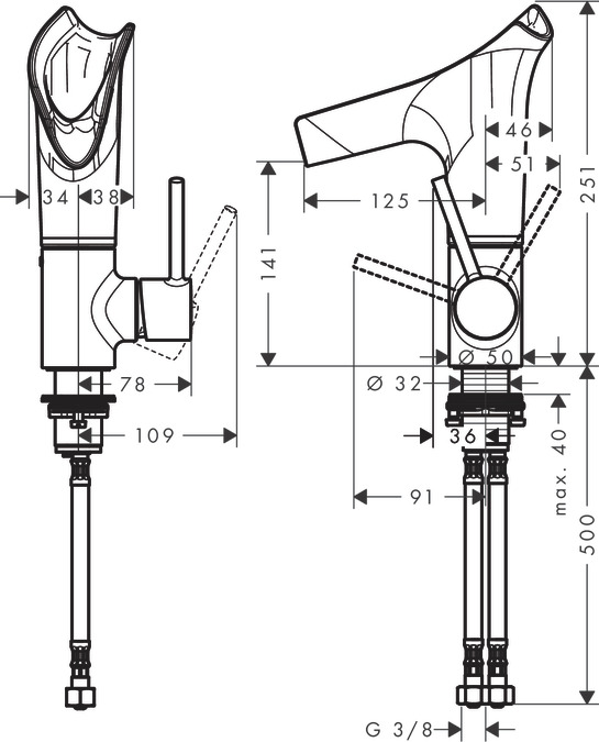 - рукоятка расположена у основания корпуса (не подходит для раковины в форме таза)