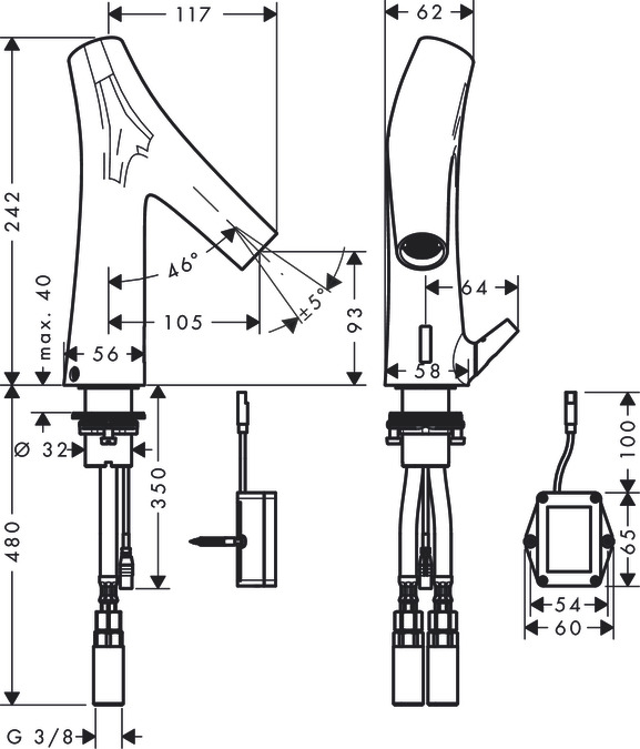 - функция может быть ограничена при использовании для раковин с возвышением или с очень широким краем раковины (> 75 мм)