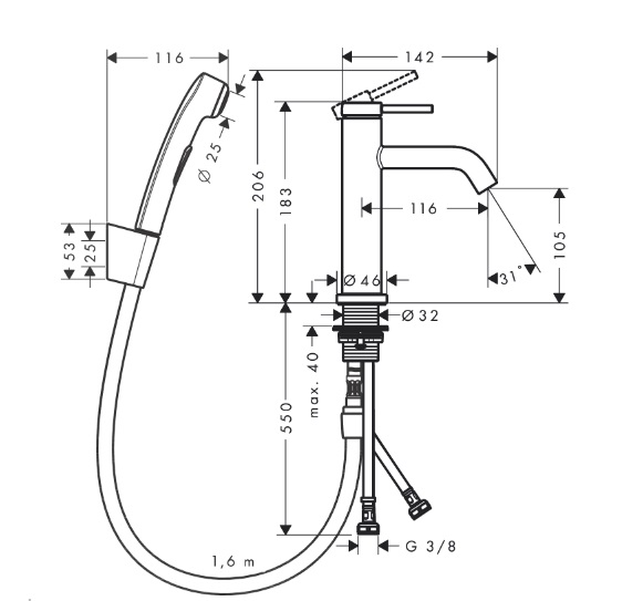 - однорычажный смеситель для умывальника 110 с ручным душем-биде и душевым шлангом 160 см